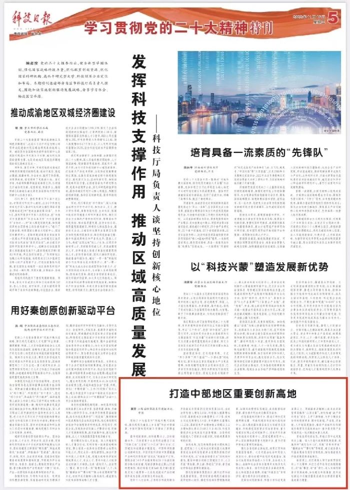 今天(11月16日),《科技日報(bào)》在學(xué)習(xí)貫徹黨的二十大精神特刊中刊發(fā)了江西省科技廳黨組書記、廳長猶王瑩的署名文章《打造中部地區(qū)重要?jiǎng)?chuàng)新高地》,F(xiàn)全文轉(zhuǎn)發(fā)。